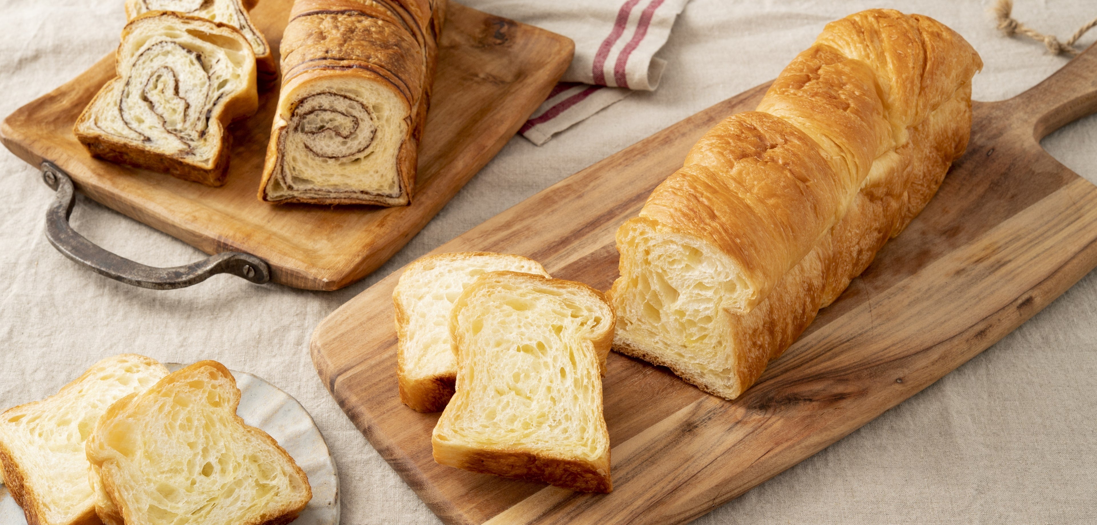 オリジナルのフレーバーで作り上げたマーガリン(発酵バター風味)を丁寧に折り重ね最後は三つ編みをして81層に仕上げております。出来上がった生地は時間をかけて発酵させて石床窯で50分焼きます。商品によってはスチームを入れてしっとりと焼き上げます。